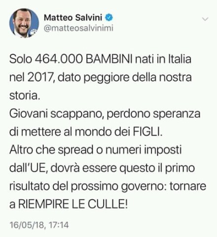 Il governo si farà. Salvini ha trovato l’accordo con Di Maio. Ho letto il suo post su facebook: entusiasta afferma che il 90% delle sue proposte è presente nel contratto di governo con i cinque stelle. La Lega ha trionfato. Salvini è tanto sicuro di sè che sottoporrà questo accordo al suo popolo che dovrà approvarlo tramite un referendum. Sarà un plebiscito. Salvini è all’apice della popolarità. C’è un punto che, però, mi tocca particolarmente. Si tratta della cosiddetta flat tax. Detto semplicemente è la rideterminazione delle aliquote fiscali per l’imposta sui redditi delle persone fisiche. Questa nuova modalità prevede due sole aliquote da applicare al reddito familiare. Fino a 80000 euro è prevista un’aliquota del 15%. Per il reddito eccedente questo limite è prevista un’aliquota del 20%. Costo totale dell’operazione, secondo Repubblica, 50 miliardi di euro. Sono arrabbiato. Sapete perchè? Salvini era quello che in piazza Duomo agitava un rosario come il più devoto dei fedeli. Salvini, solo qualche giorno fa, in un post su facebook, rilevava come il problema dell’Italia fosse la denatalità. Prometteva di riempire le culle. E invece? Se ne esce con questa soluzione. Soluzione peraltro non inattesa. Era prevista nel suo programma di governo con cui si è presentato alle elezioni di marzo. Sono arrabbiato perchè il Forum delle Famiglie nel 2012 presentò in Senato una proposta di adozione del fattore famiglia. Una modalità di tassazione che davvero veniva incontro alle famiglie e in particolare a quelle numerose. Costo previsto 16 miliardi. Oggi Salvini se ne esce con questa proposta. Proposta che ripeto costa 50 miliardi. Per ottenere cosa? Che io, padre di famiglia, di una famiglia normale, con un reddito medio e con quatto figli, pagherò circa 1000 euro in più di tasse.