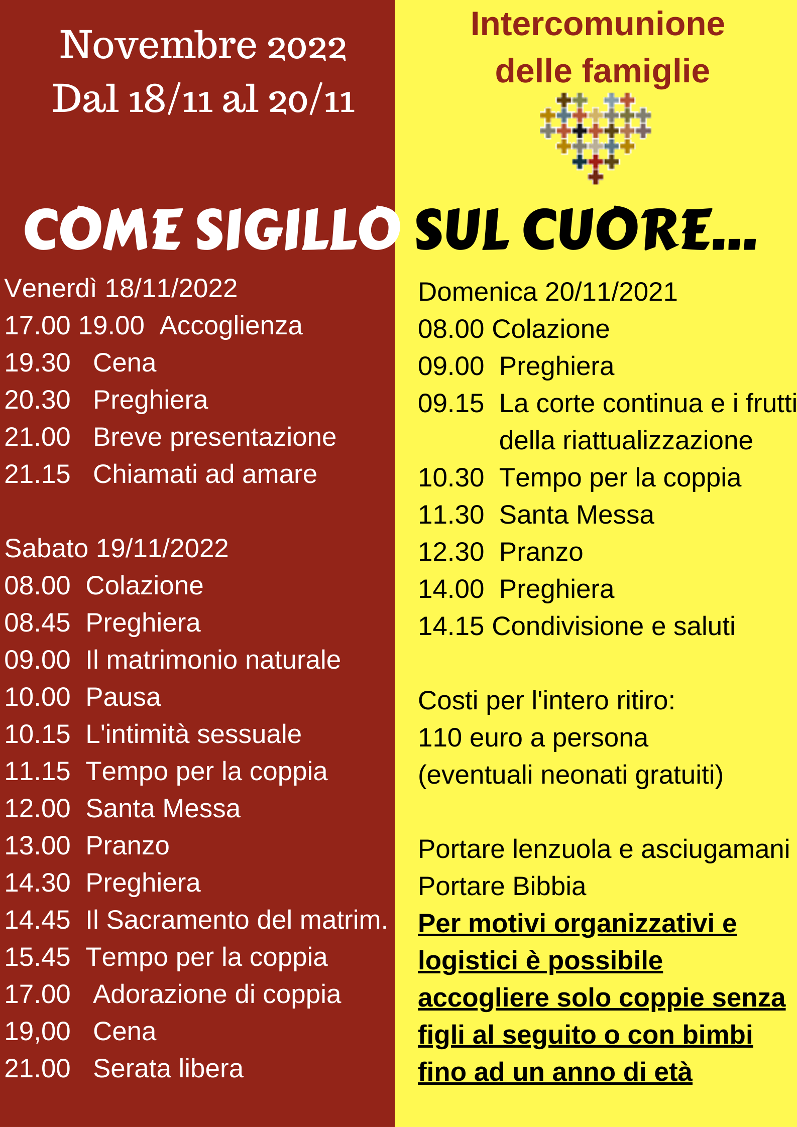 Cosa tratteremo nel corso? E’ un corso che io e Luisa abbiamo frequentato più di vent’anni fa e ci ha cambiato la vita in meglio. Dopo questo corso abbiamo capito cosa significa essere sposi, come nutrire il nostro rapporto, quali sono i pericoli da evitare. Come vivere non solo un matrimonio vero, ma soprattutto, un matrimonio felice. Pregheremo, adoreremo, parleremo, insegneremo, ma non solo. Ci saranno tanti momenti per la coppia. Marito e moglie avranno tanto tempo per dialogare su quei temi che cercheremo di provocare. Si parlerà di amore, di tenerezza, di Grazia, di intimità fisica, di cura, di servizio. Si parlerà dell’amore naturale degli sposi e dell’amore perfezionato dal sacramento. Si parlerà di intimità come una vera liturgia e dell’amplesso come gesto che rinnova un sacramento. Il tutto sarà guidato da noi, ma non solo. Un’equipe di cinque famiglie vi accompagnera coadiuvata da don Gianni