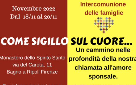 Ciao carissimi visto il tutto esaurito del week end appena concluso ad Angolo Teme all’inizio di settembre e vista la disponibilità del gruppo Intercomnunione di Firenze e di don Gianni Castorani ad ospitarci ed accompagnarci siamo lieti di proporvi una nuova data del week end: Bagno a Ripoli (Fi) dal 18 al 20 novembre.
