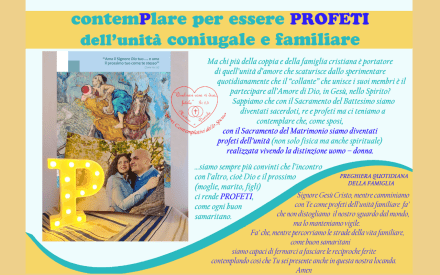 Cari sposi e famiglie, iniziamo questo nuovo anno mettendoci in contemPlazione per essere PROFETI di unità e lo facciamo in comunione con tutti i cristiani che in questa settimana (18-25 gennaio) pregano per la fraternità universale, quel sogno di Dio che a noi è consegnato come “dono” da custodire e quale “compito” da realizzare. È un sogno diurno, delle prime luci dell’alba, quindi profetico e carico di speranza, che ha bisogno del contributo di ciascuno di noi, delle nostre Chiese e Comunità cristiane.