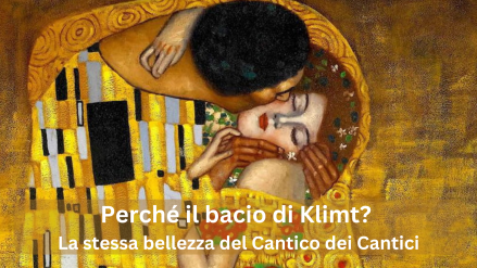 La posizione dei due amanti nell’opera di Klimt, in cui l’uomo si piega verso la donna per baciarla mentre lei si abbandona con fiducia, richiama i versi del Cantico: “Mi baci con i baci della sua bocca!” (Ct 1,2). Questo verso esprime la profondità del desiderio e la bellezza dell’amore vissuto pienamente. Allo stesso modo, il dipinto di Klimt sembra fermare il tempo in un momento di connessione totale, una fusione delle anime oltre che dei corpi.