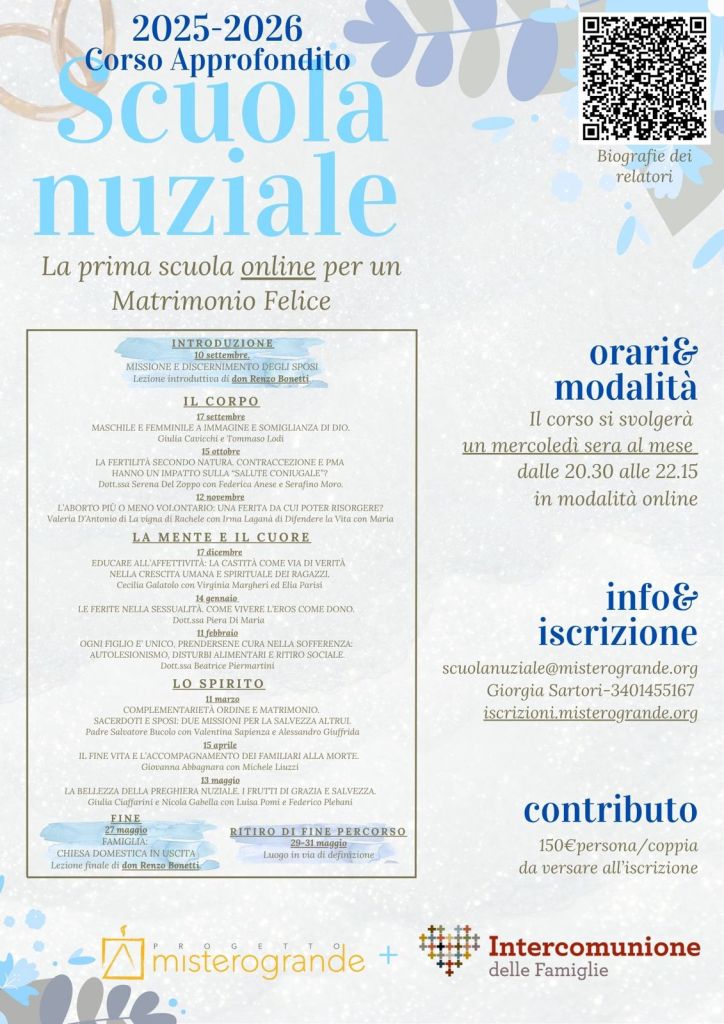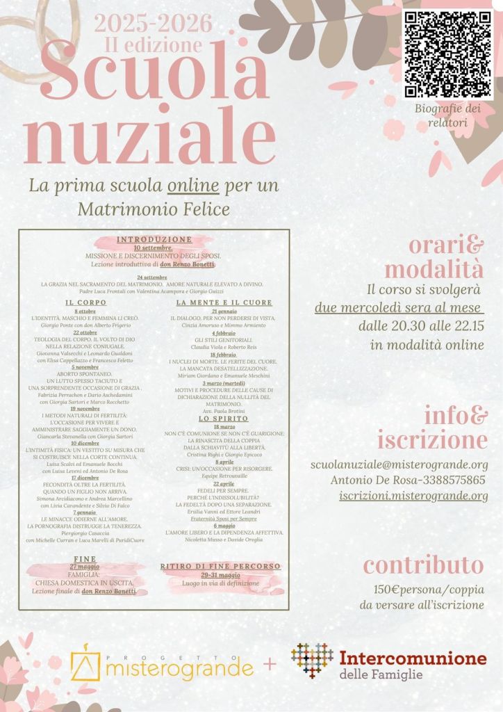 Quello che abbiamo ideato vuole essere un percorso di scoperta o di riscoperta della grandezza e della bellezza del matrimonio cristiano. Un percorso che non escluda nessun aspetto della vita matrimoniale. Noi abbiamo una ricchezza di grazia enorme. Dobbiamo però conoscere il nostro sacramento. Ma non basta ancora. Dobbiamo conoscere il nostro corpo, la nostra sessualità, la nostra psiche, le nostre ferite, le nostre risorse naturali e spirituali. Solo così potremo affrontare il matrimonio nella giusta prospettiva e riconoscerne il valore anche in mezzo alle difficoltà. Vi aspettiamo! Per ogni dubbio siamo a disposizione. Il percorso è organizzato da Intercomunione delle Famiglie in collaborazione con Mistero Grande.